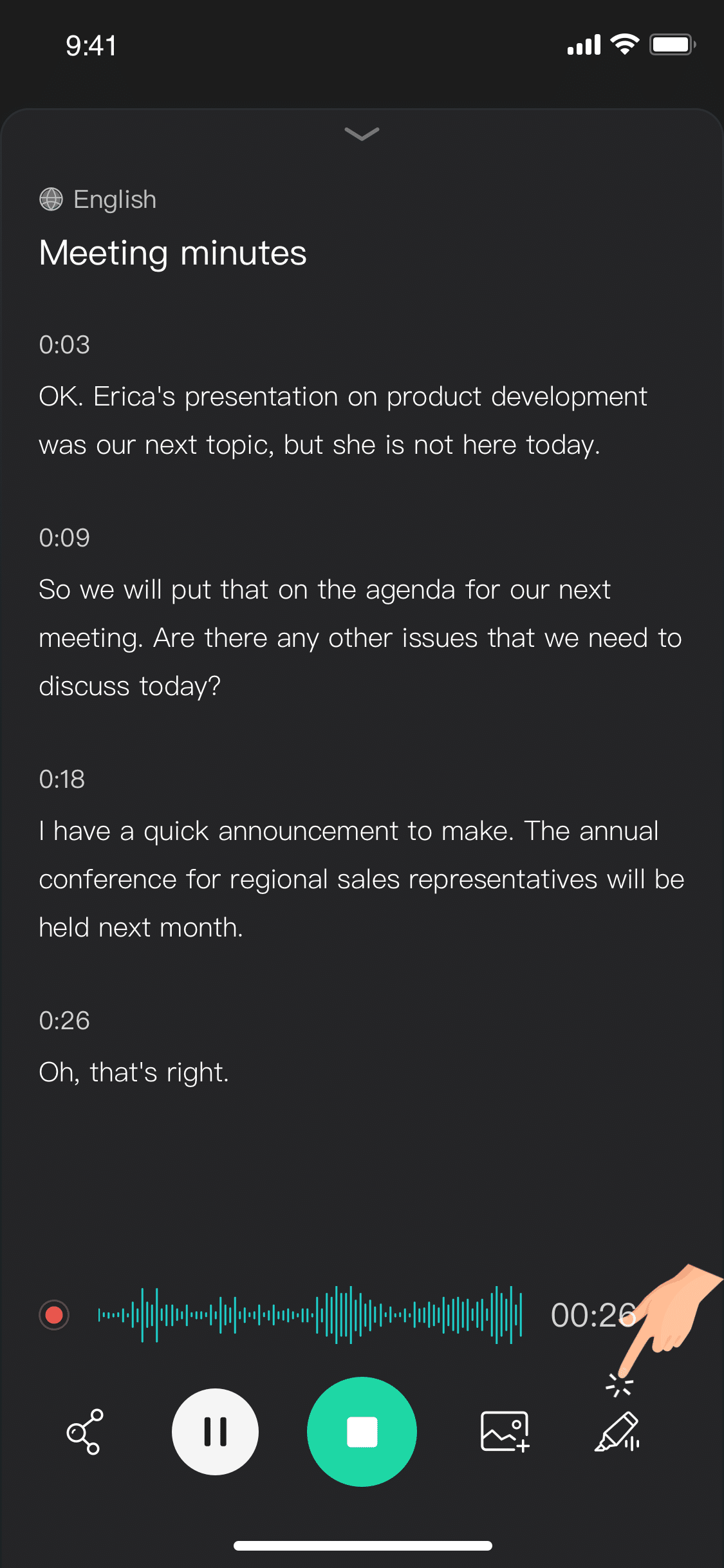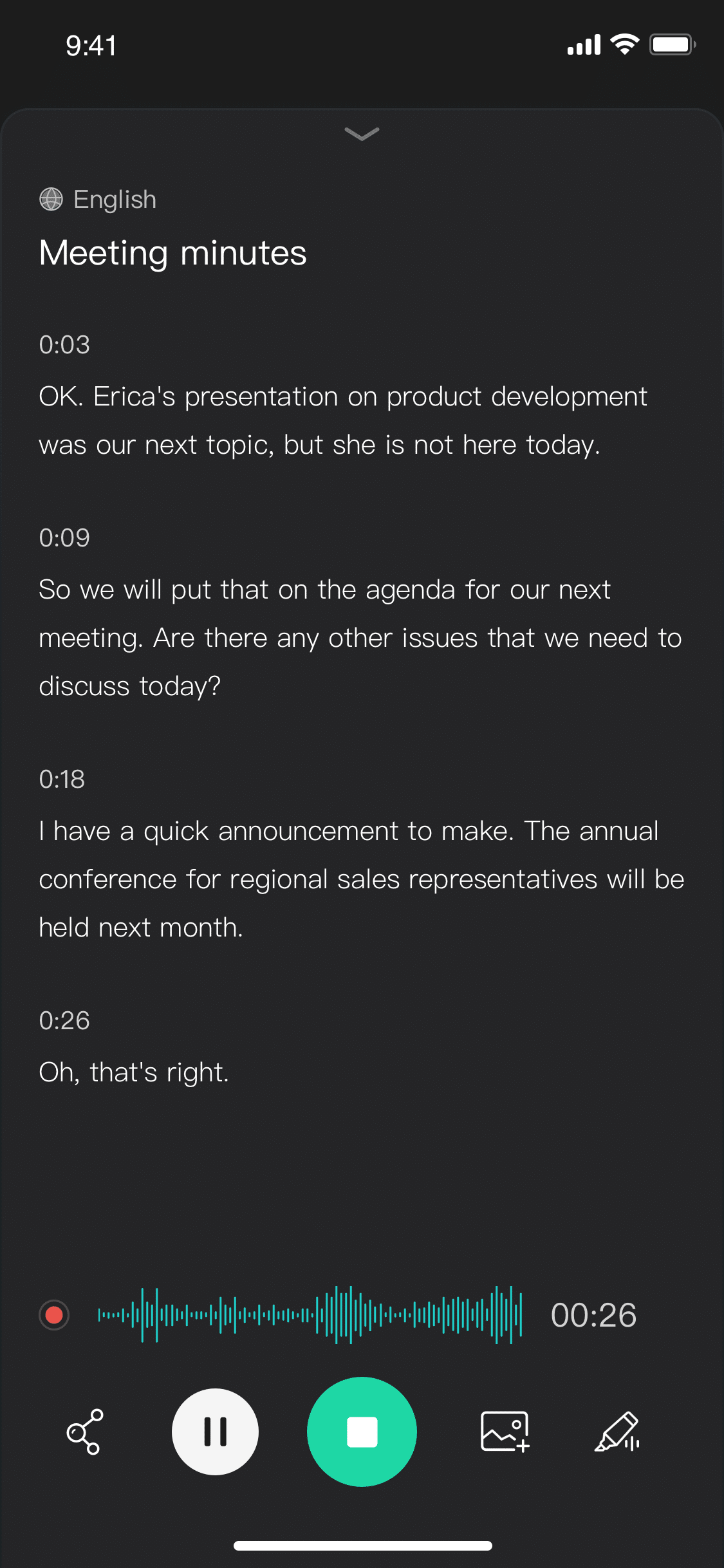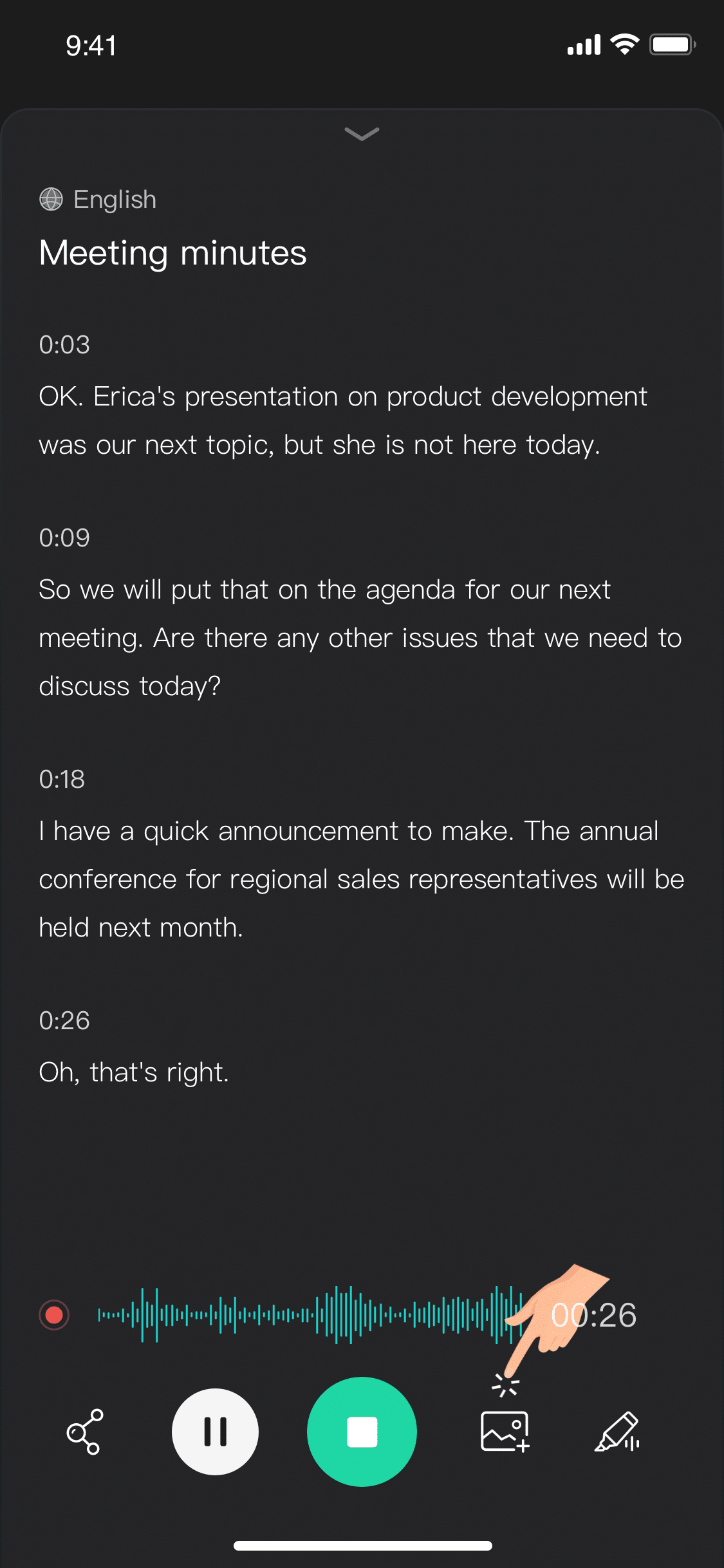 Inserting images, audio marks and sharing the text with others are supported during the real-time transcription.