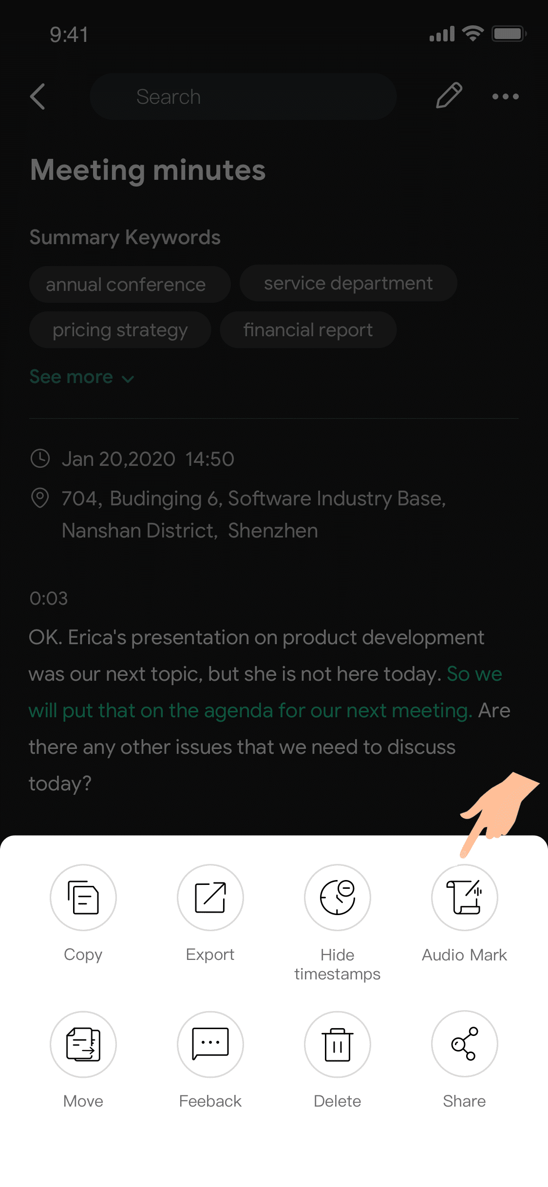 After recording, enter into the conversations and click the【More】button ,the mark list, to enter the mark list option to locate and trace the important moments during the recording.