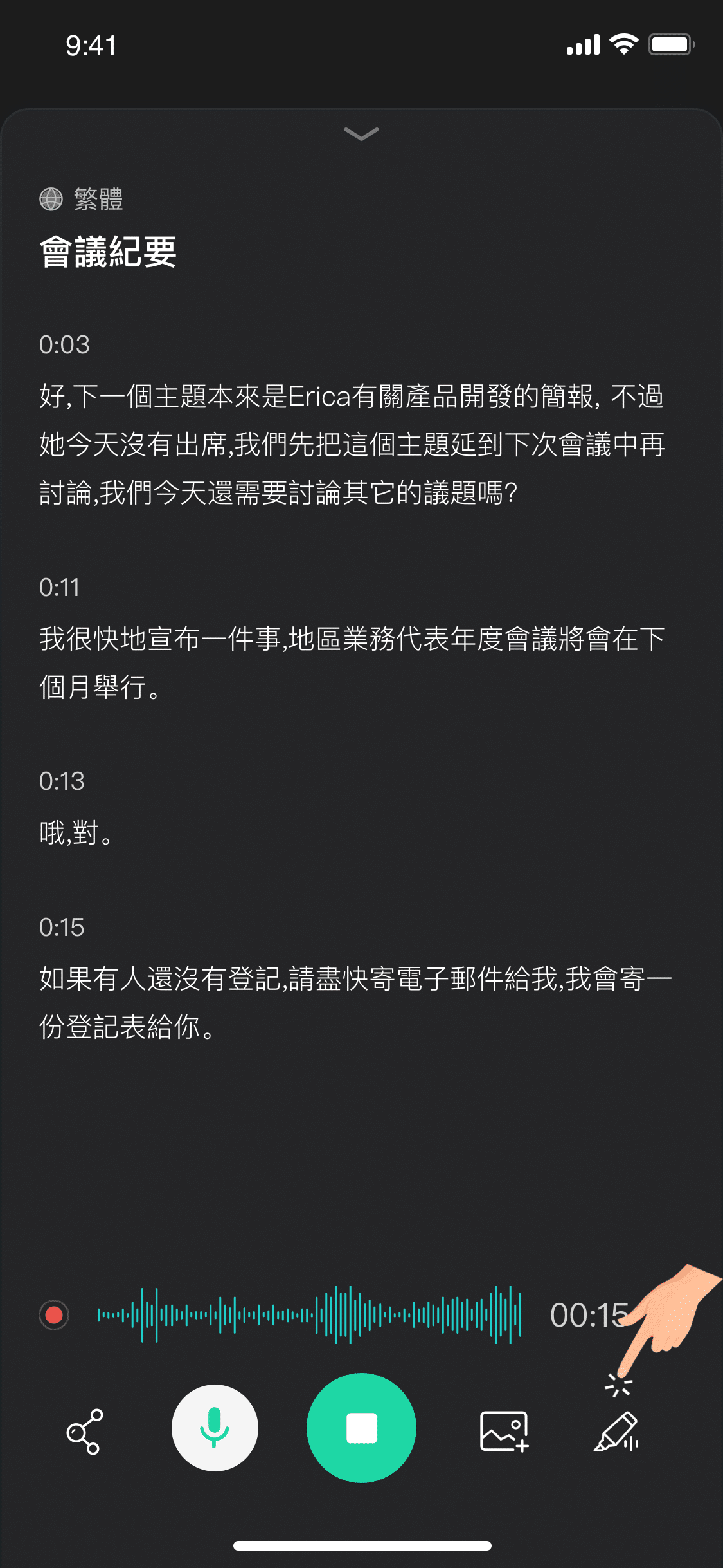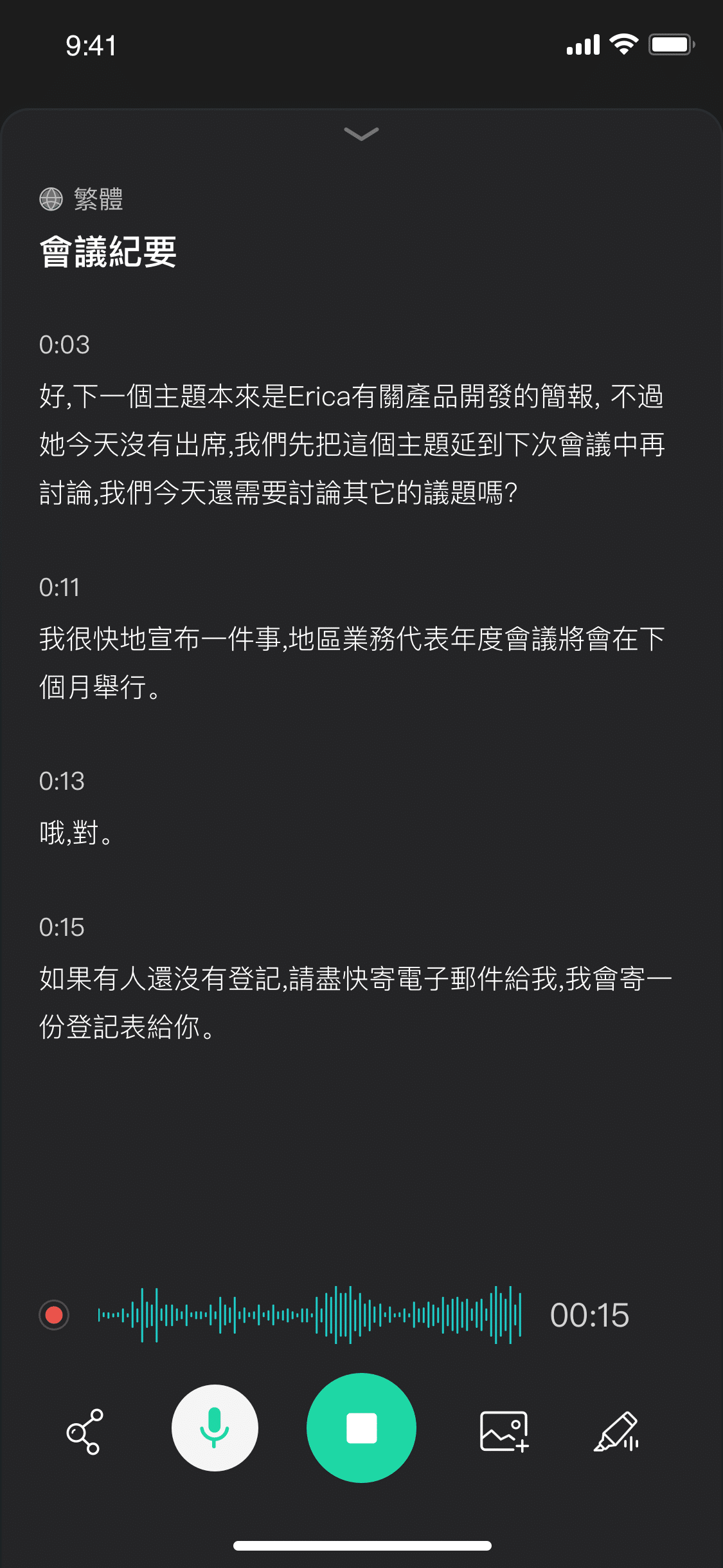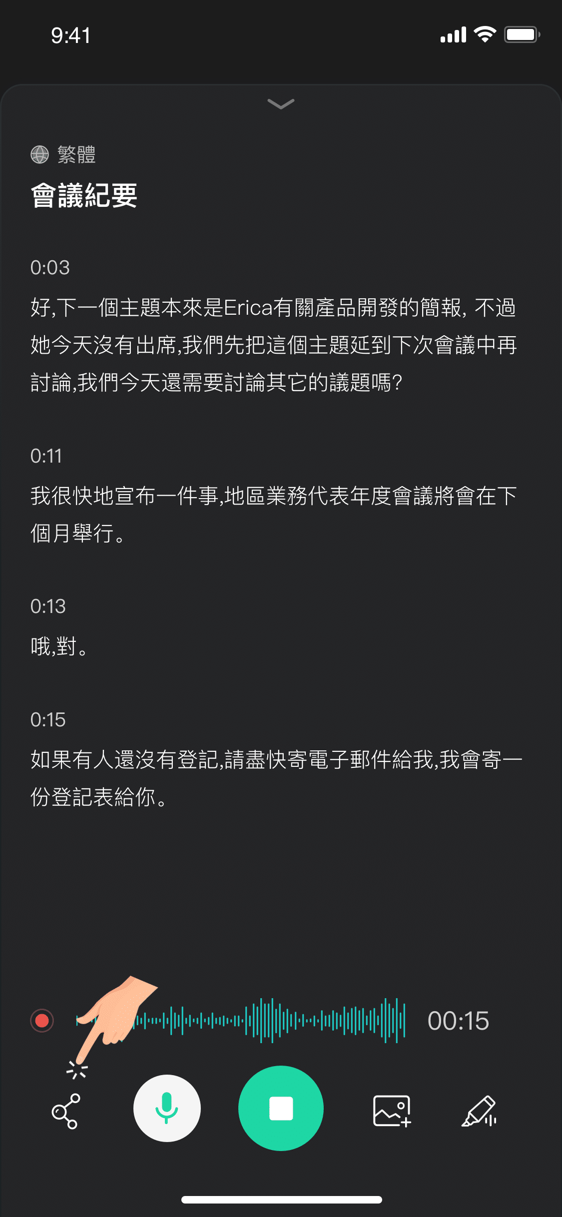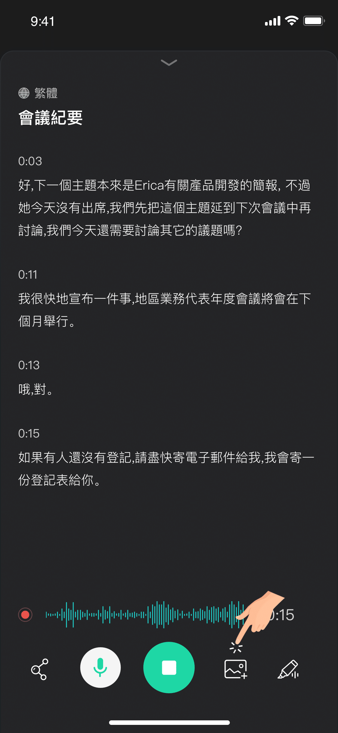 在即時轉錄過程中,您還可以進行插入圖片、音檔標記、文字即時分享等操作。