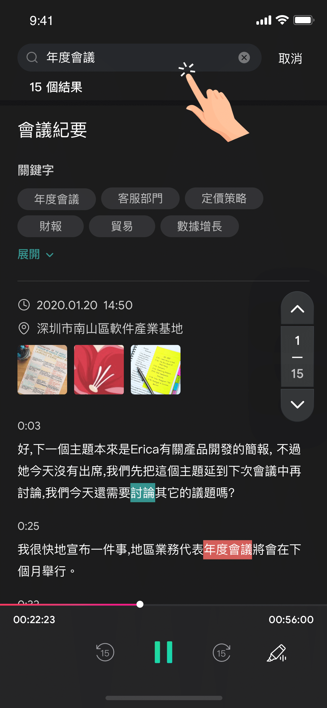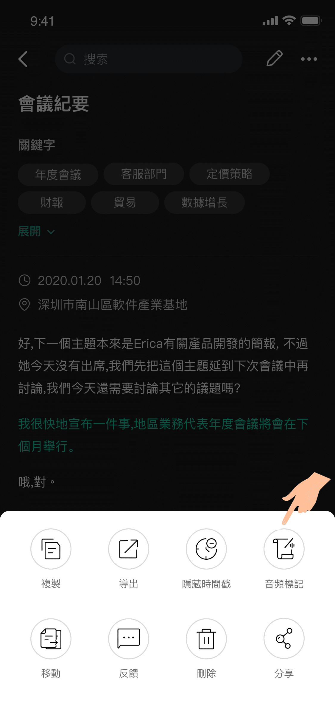 在錄音結束後,進入資料點選右上角【更多】按鈕,可以進入音檔標記清單選項,觀看並移動至錄音中的重要時刻,避免錯過關鍵瞬間。