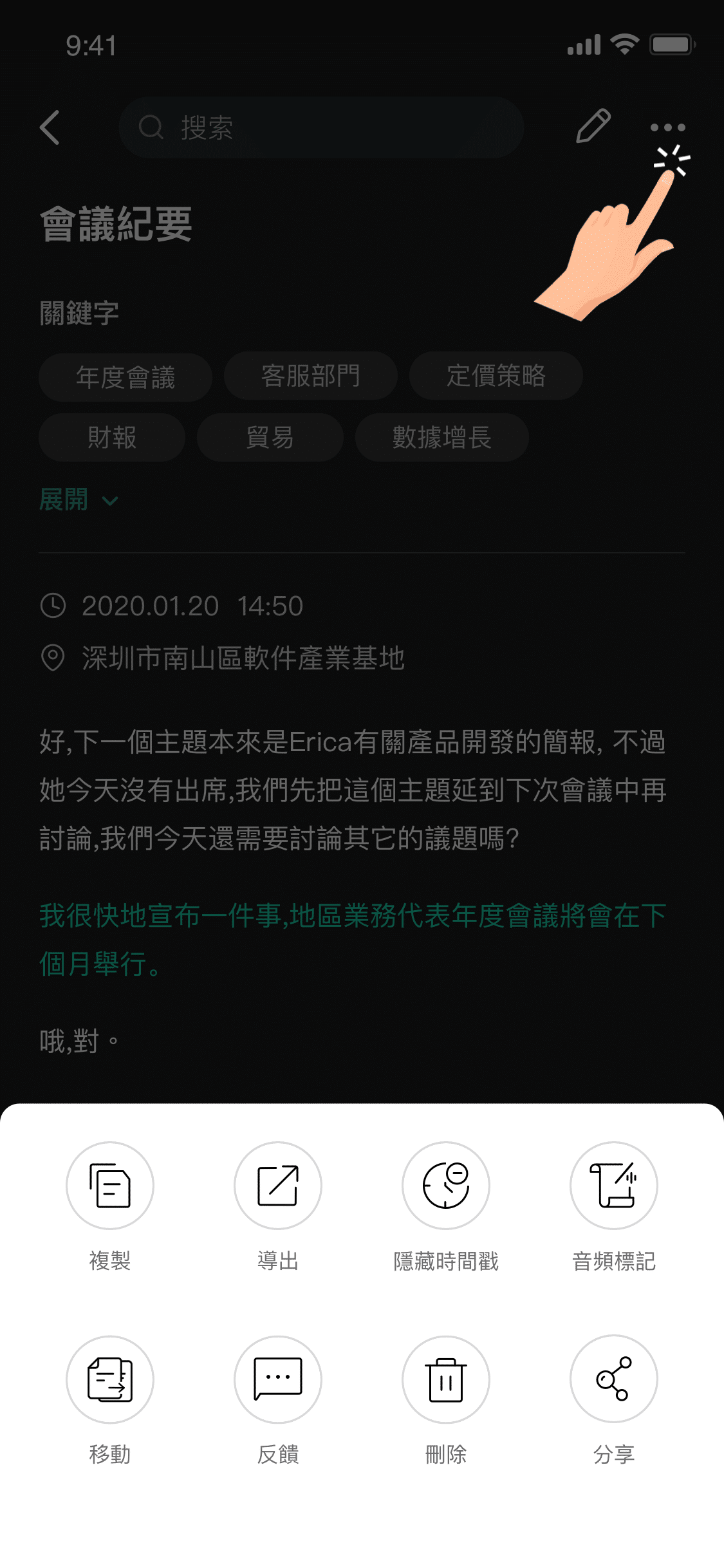 您可以在新增的資料夾中點選開始錄音,該條錄音會話將會自動歸類於目前資料夾中;錄音結束後進入會話資料後,再點選右上角的更多,選擇移動,將該會話放置到指定的資料夾中。