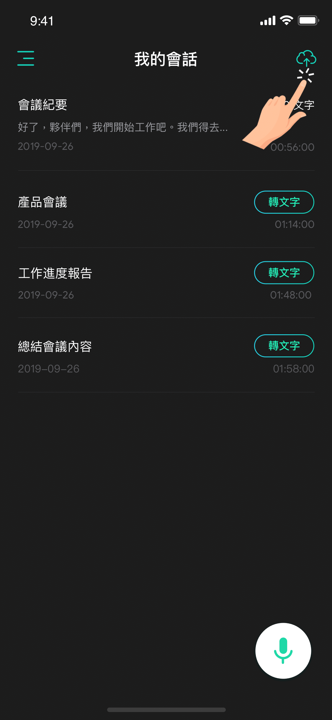 當點選錄音結束 或 匯入並轉寫音檔後,目前資料夾內會出現一則會話紀錄。