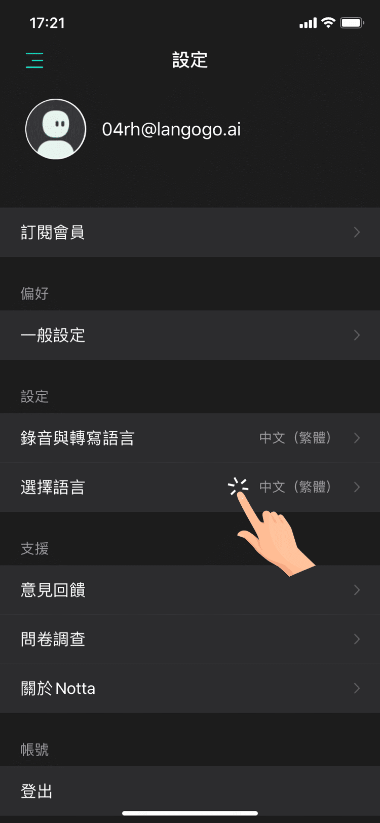 例如:您可以在這裡選擇應用程式的語言,Notta 提供了中文、英文、日文、繁體 4 種語言文字。